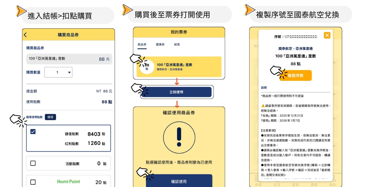 - 兌換完成後票券序號始生效,恕無法取消、無法更改,亦無法退還點數。