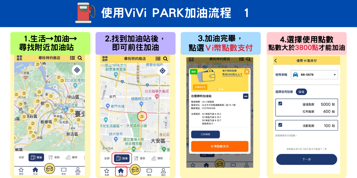 會員可透過 ViVi PARK APP 於指定加油站繳付「加油費」,據點涵蓋台北、新北、桃園、新竹、台中、彰化地區之中油及台塑加油站。您的Vi幣總點數達【3,800 點】即可啟用本服務,並可選擇以Vi幣或 Hami Point 扣點結帳。Vi幣儲值滿千起最高可享 5% 紅利回饋! (點我詳見儲值好康)