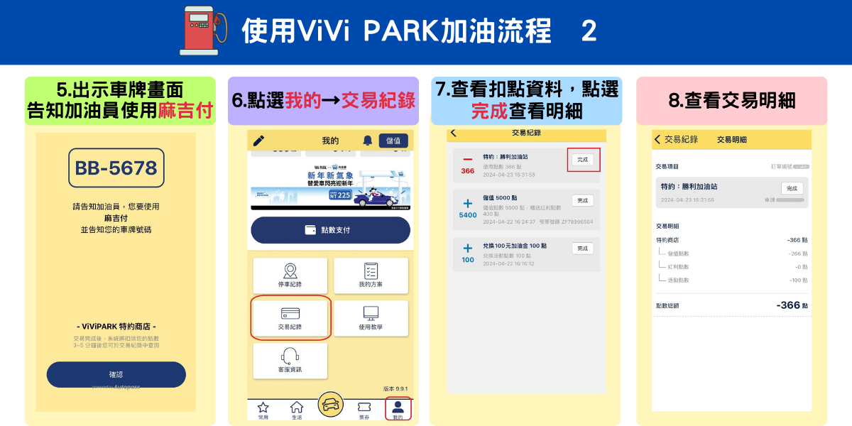 點擊首頁【加油】→選擇合作加油站據點→點擊【Vi幣點數支付】→勾選使用點數(儲值點數/紅利點數/活動點數/Hami Point)→告知加油站店員使用【麻吉付】結帳