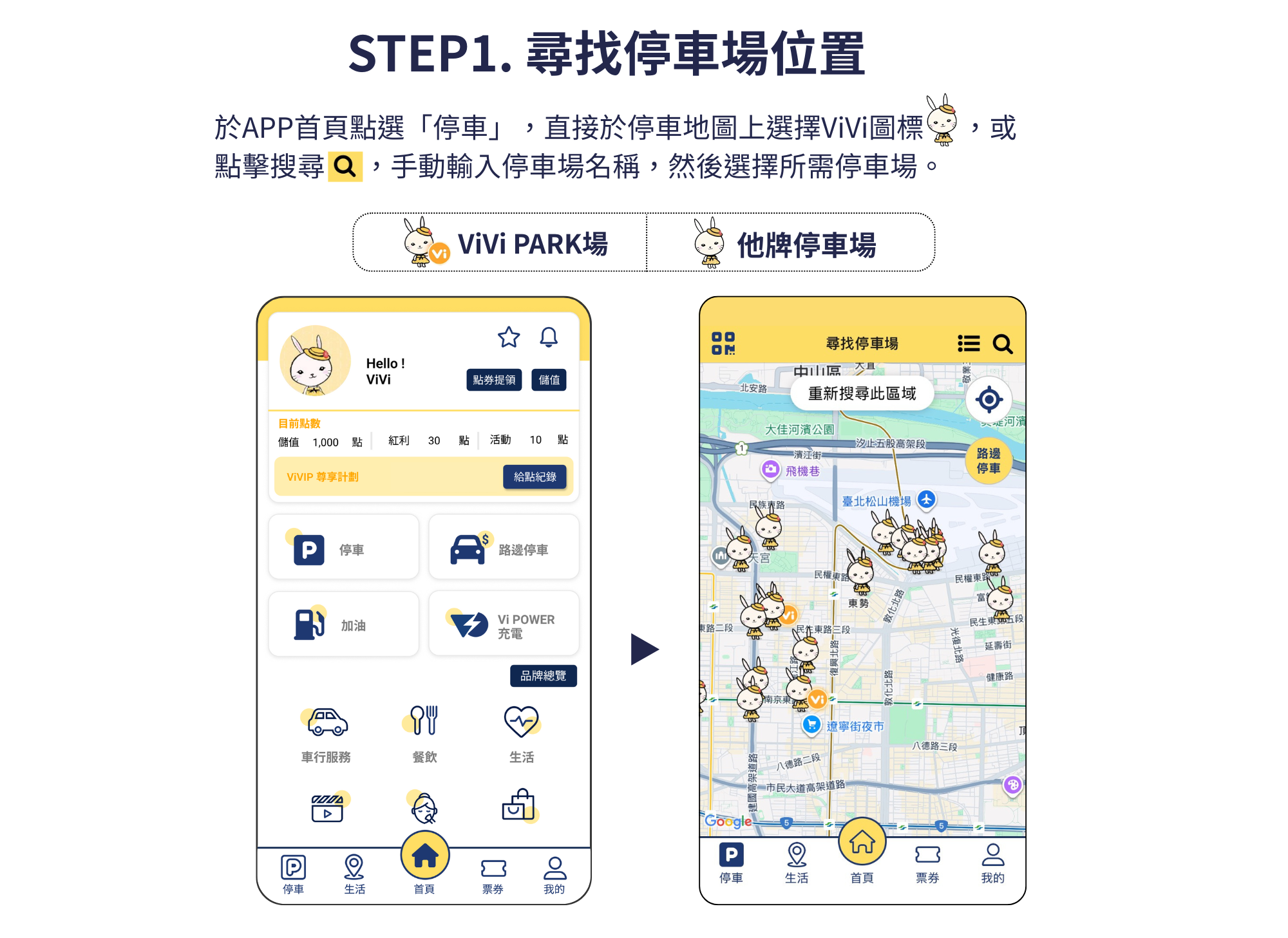 ViVi PARK APP 全新改版地圖,不再侷限於 ViVi PARK 自有停車場,進一步整合周邊停車場業者資訊,一手掌握1,000+ 停車場的位置、費率與一鍵導航,旅遊或造訪陌生地點時,停車省時省力不煩惱,選擇多更多!APP操作流程如下: