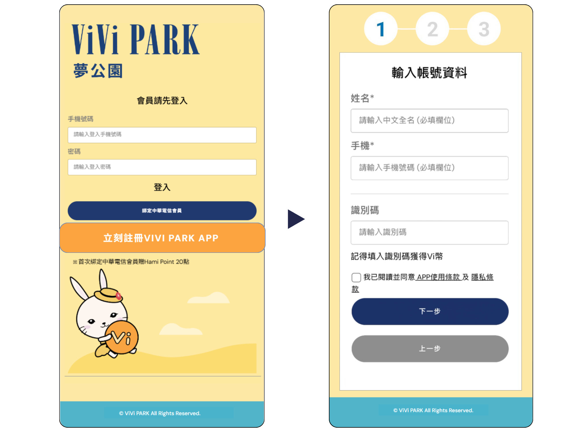 - 第一步:於ViVi PARK 網頁,點擊「立刻註冊ViVi PARK APP」,輸入姓名、手機號碼及識別碼「hami」,閱讀並勾選同意相關條款,點按下一步