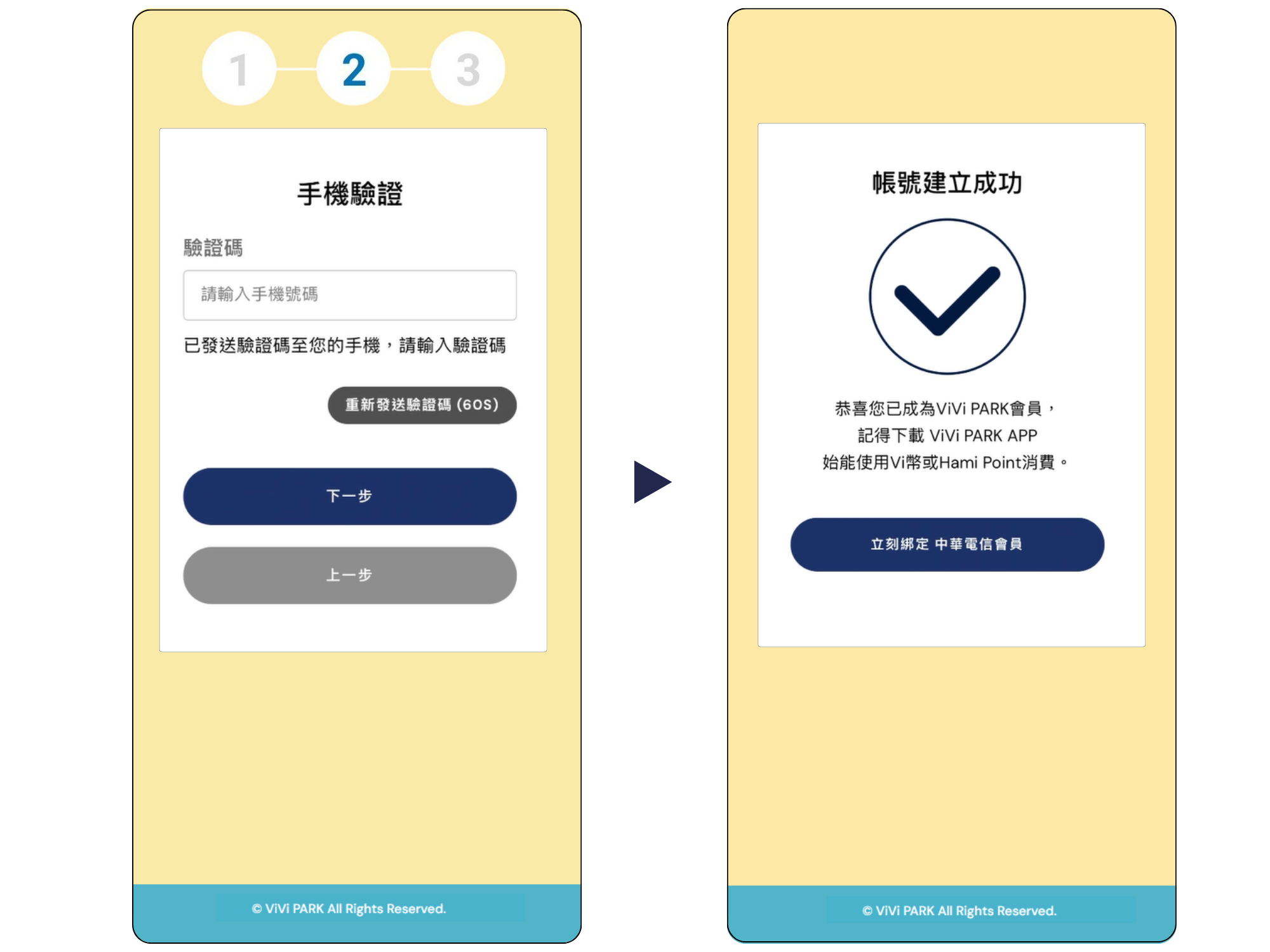 - 第二步:完成手機號碼驗證及設定密碼,即成為 ViVi PARK 會員。接著點擊「立即綁定中華電信會員」,即可前往綁定