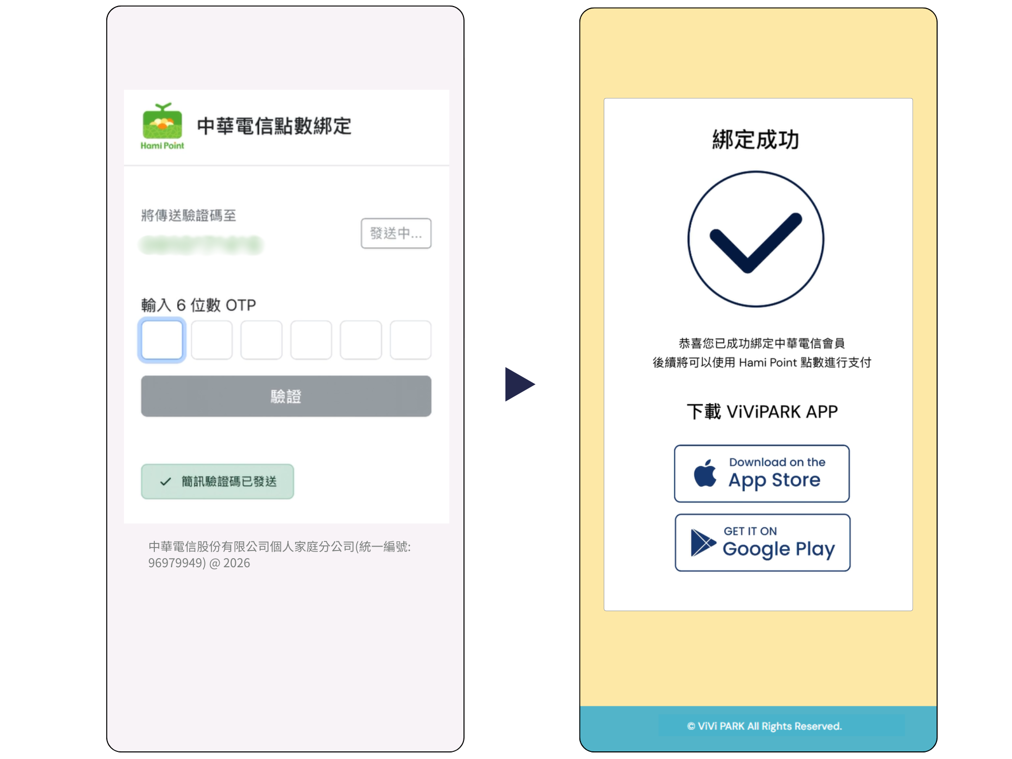 - 第二步:驗證與中華電信點數綁定,完成綁定將可於 ViVi PARK APP 使用Hami Point 扣抵費用