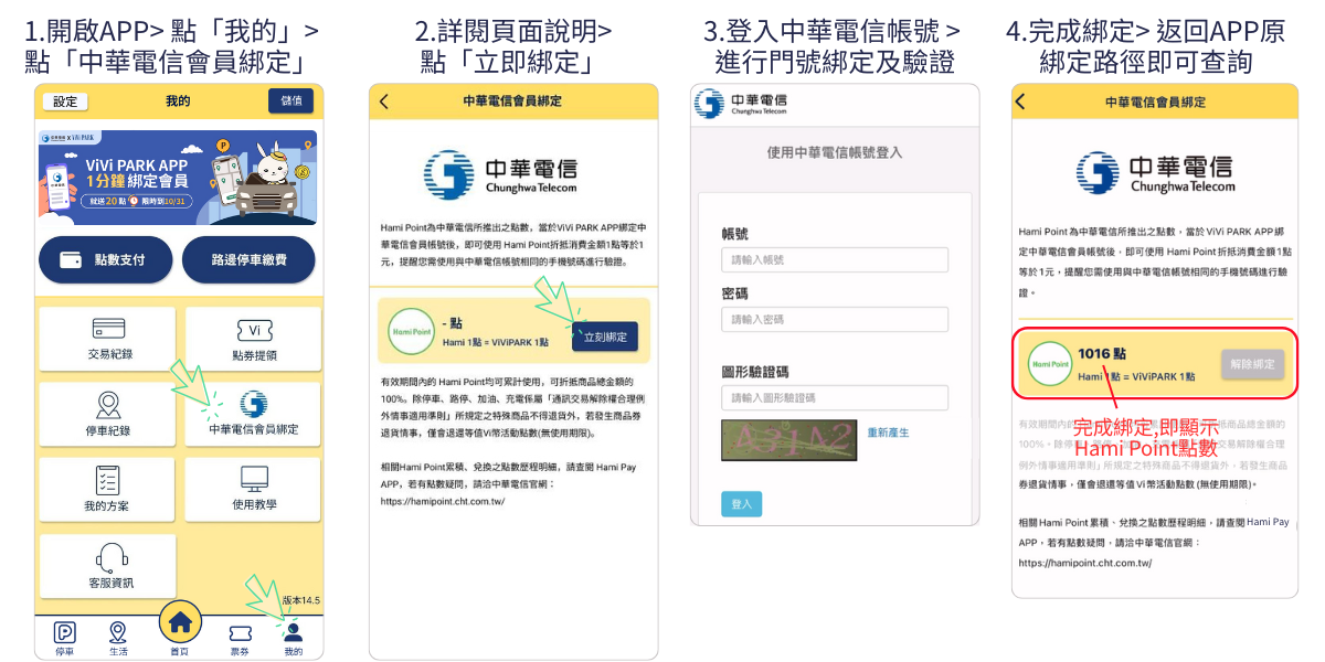 - 每個ViVi PARK帳號僅限綁定一個中華電信帳號,且同一中華電信帳號不得被多個ViVi PARK帳號綁定。