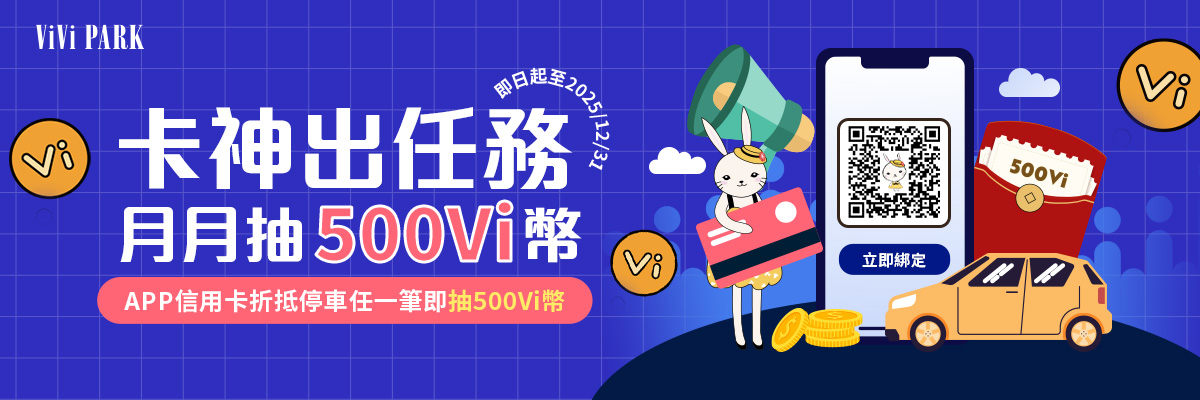 🎁即日起至 2025/12/31,停車使用APP信用卡折抵,就有機會獲得 Vi幣500點(價值500元)
