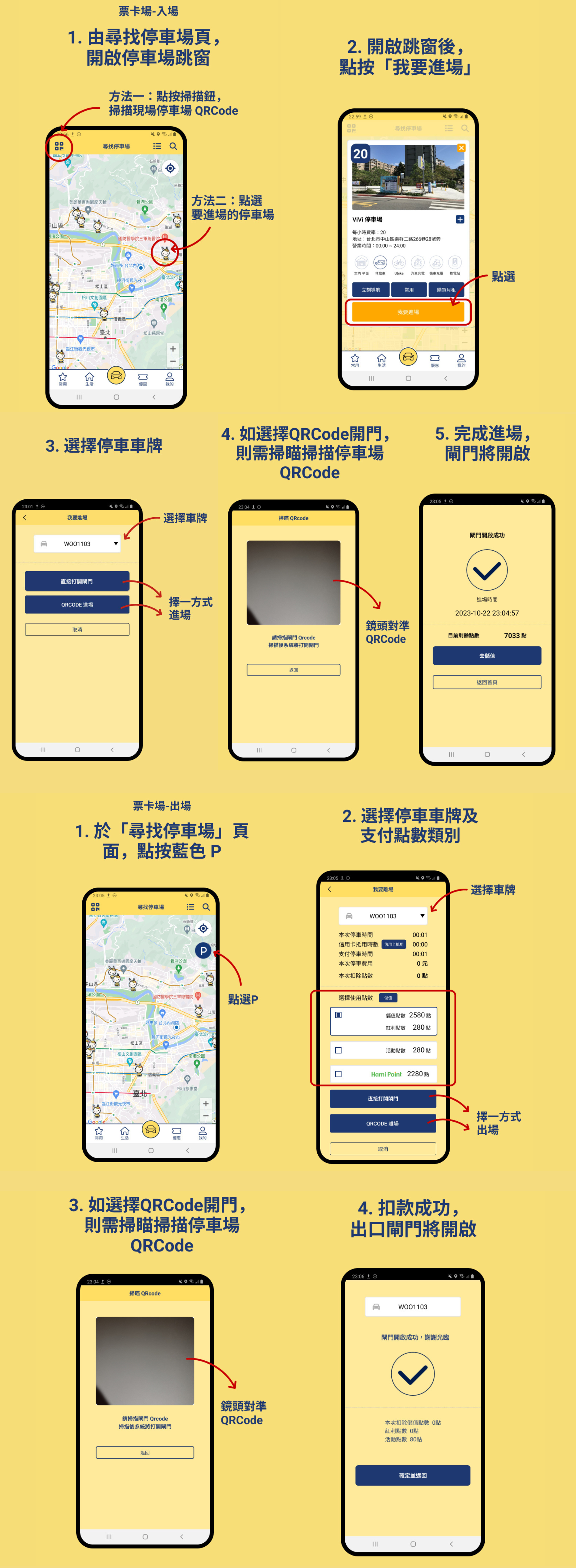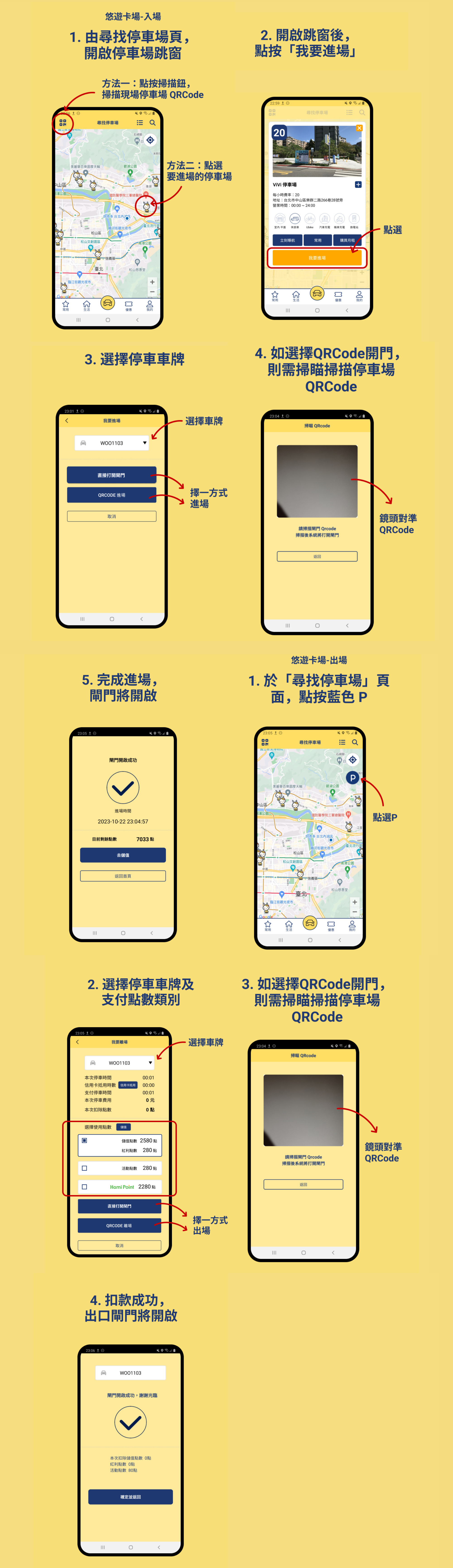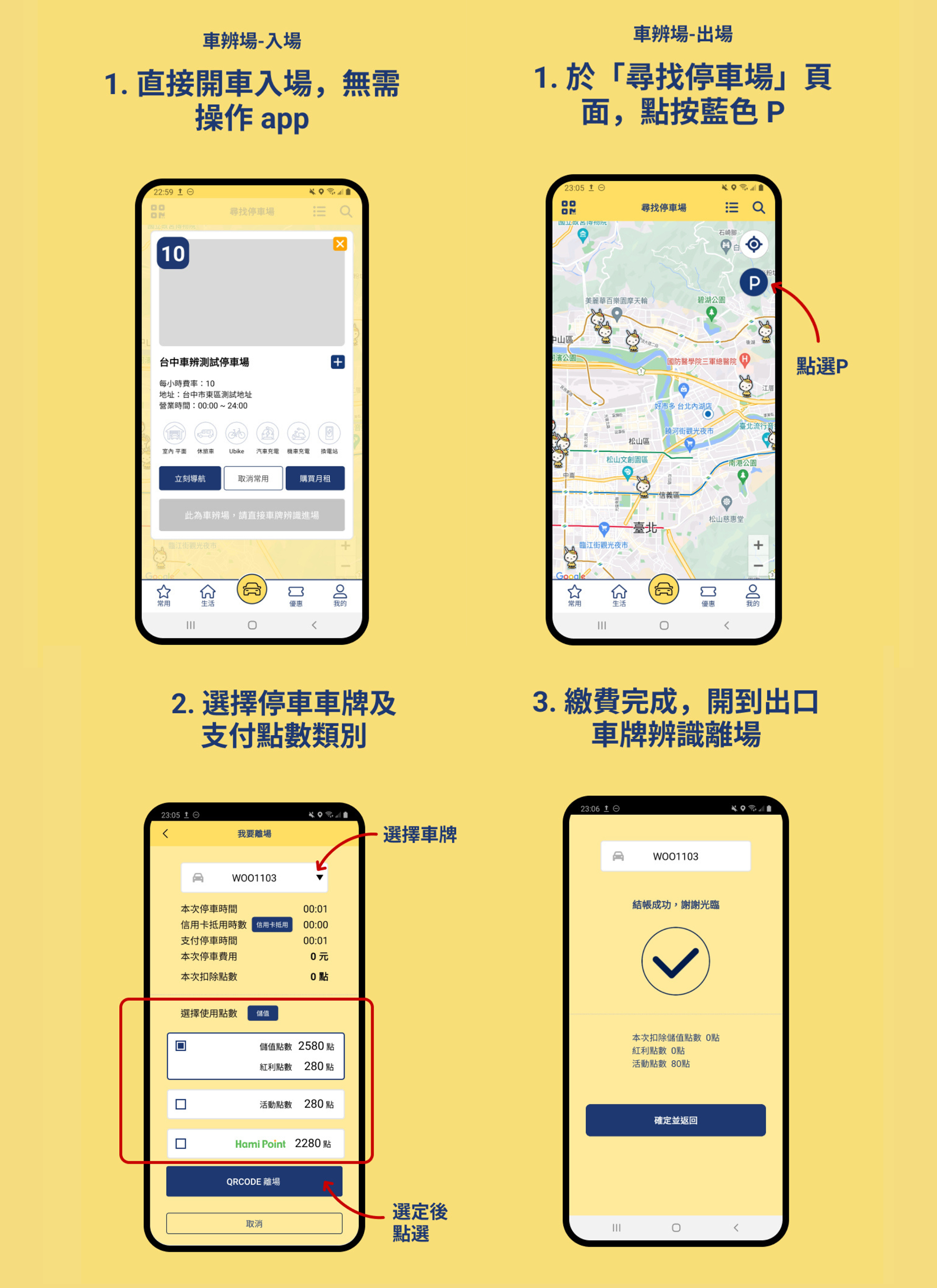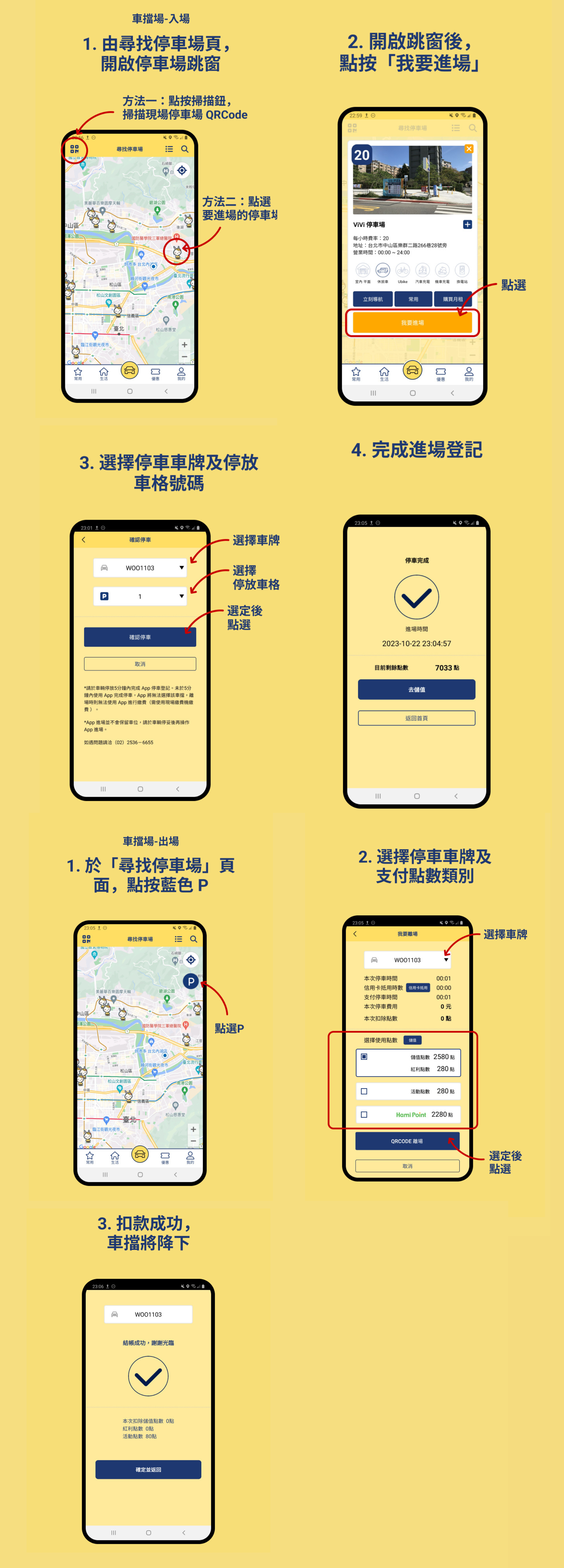 會員可直接透過 ViVi PARK APP 操作臨停車輛的進出場,離場前免下車、免至繳費機排隊,您可選擇以 Vi 幣或 Hami Point,輕鬆完成線上扣點繳費。Vi 幣儲值最高可享 5% 紅利回饋。首次使用,請務必於車輛進入停車場前完成 APP 註冊並綁定車牌號碼,進出場皆須透過 APP 操作。進出場流程如下: