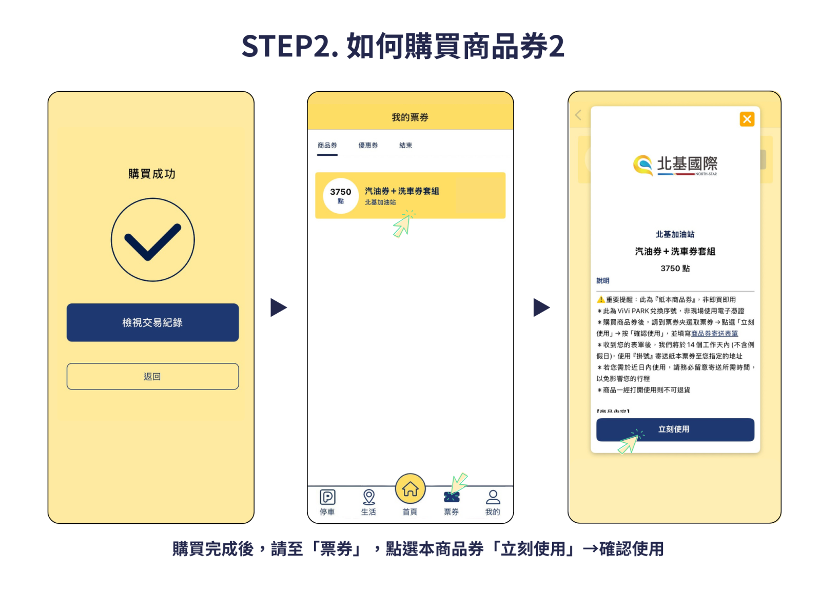 - 購買商品券後,請至APP「票券」→ 點選「立即使用」→「確認使用」→線上填寫【商品券寄送表單】→透過掛號寄出紙本票券至所登記地址。