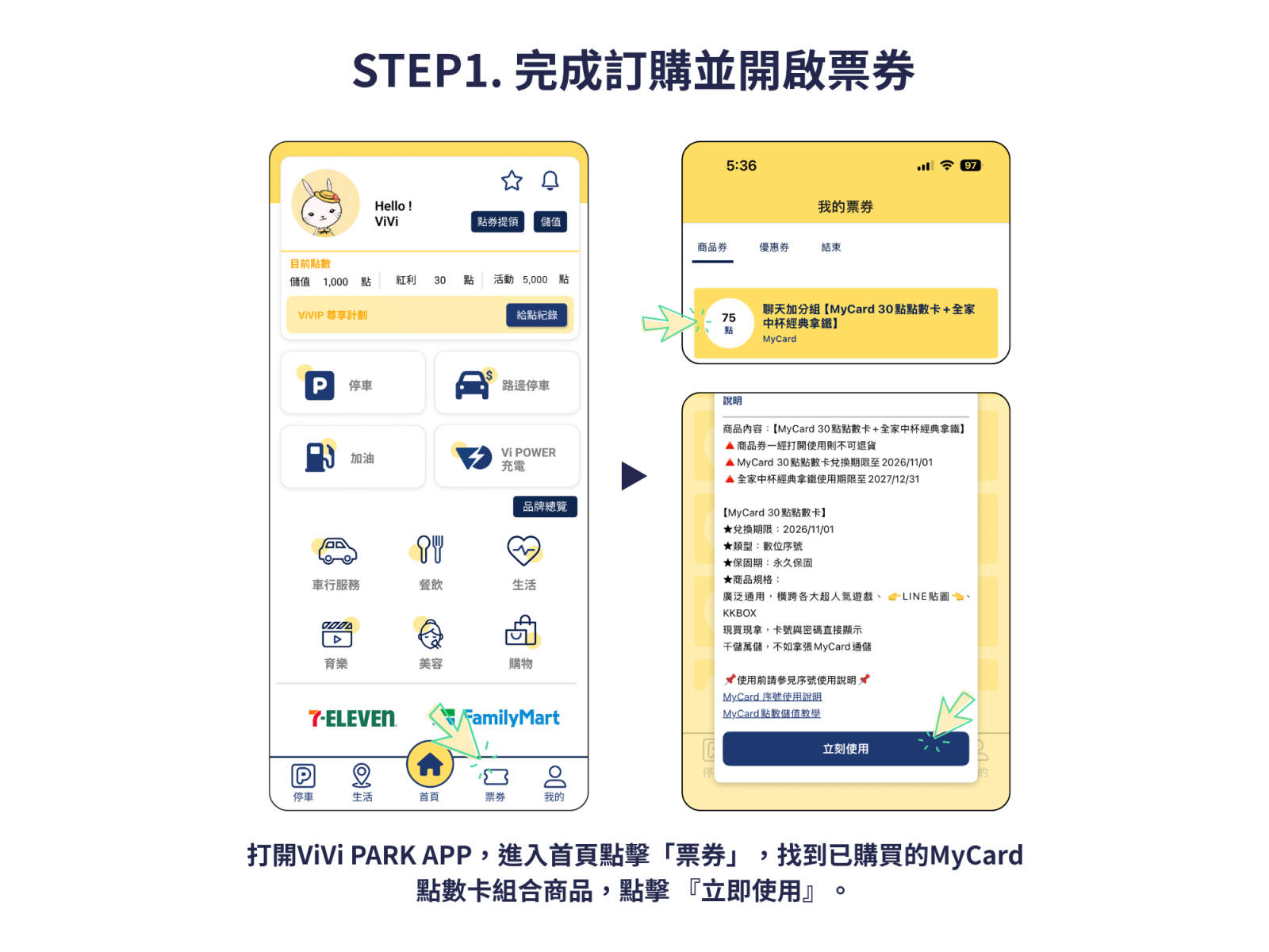 打開ViVi PARK APP ➔ 前往『票券』 ➔ 找到已購買的MyCard點數卡組合商品 ➔ 點擊 『立即使用』